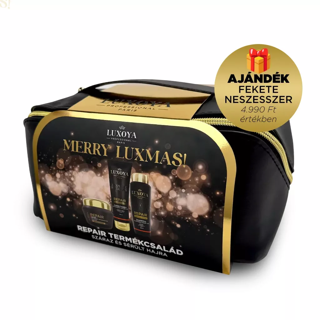 Luxoya REPAIR Karácsonyi Ajándékcsomag + Ajándék Fekete Neszesszer (száraz és sérült hajra)